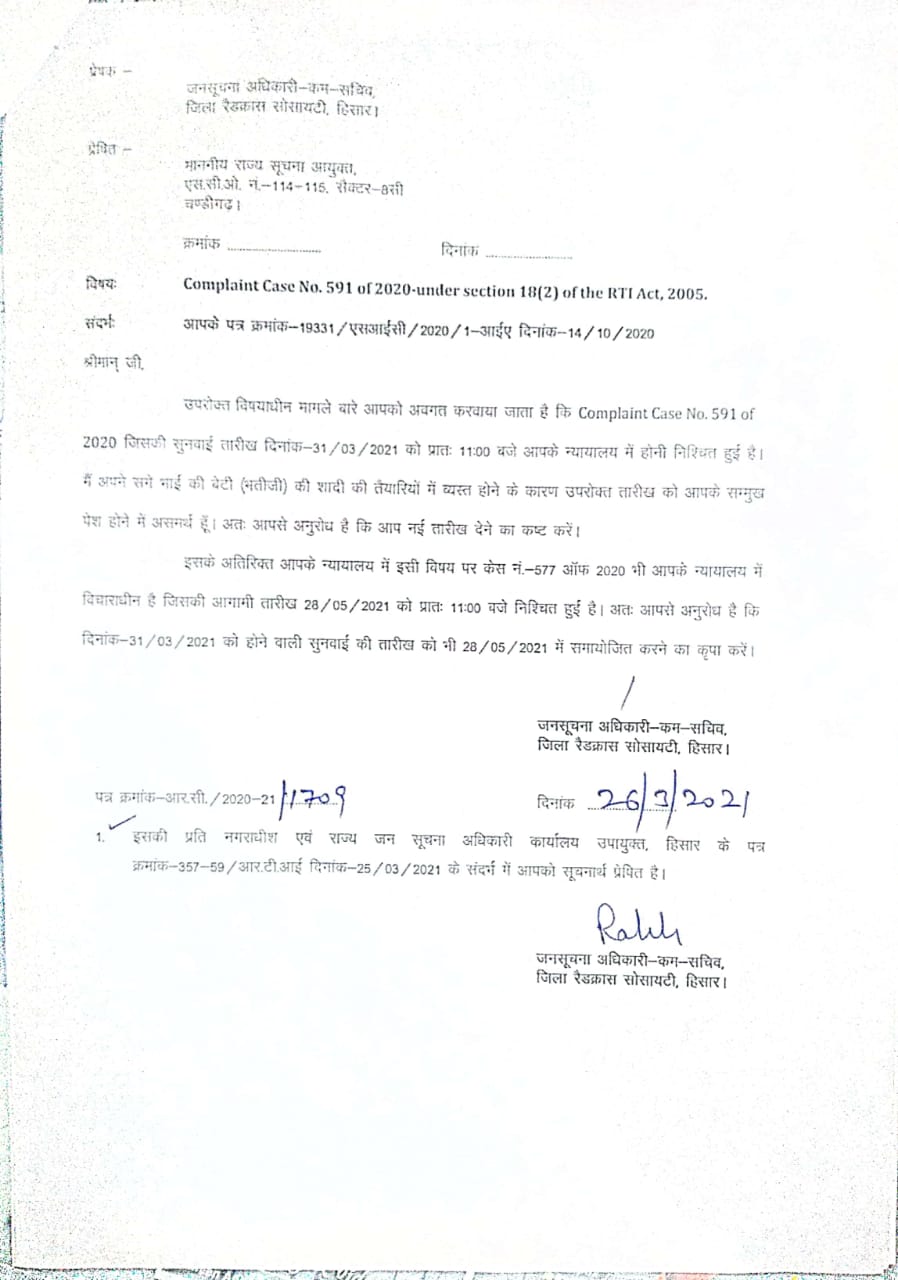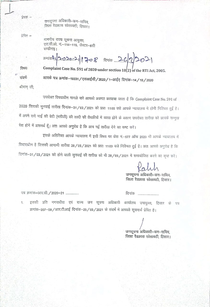 Complaint Case No. 476 of 2021 under Section 18(2) of the RTI Act, 2005